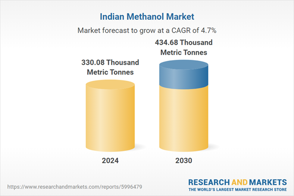 India Methanol Market achieved a total market volume of 330.08 thousand Metric Tonnes in 2024 and is anticipated to reach 434.68 thousand Metric Tonnes by 2030, with a CAGR of 4.73% during forecast period.