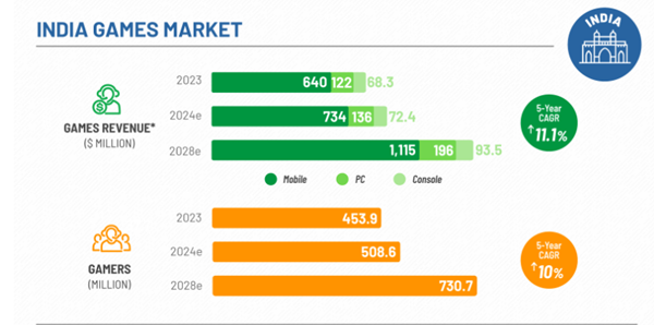 - The India video games market is set to grow 13.6% in 2024, with revenue of $943 million, surpassing $1 billion in 2025, and is forecasted to reach $1.4 billion in 2028, growing at a 5-year CAGR of 11.1%.