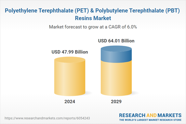 The combined global PET & PBT resin market size was USD 47.99 billion in 2024, and it is anticipated to be worth USD 64.01 billion by 2029.