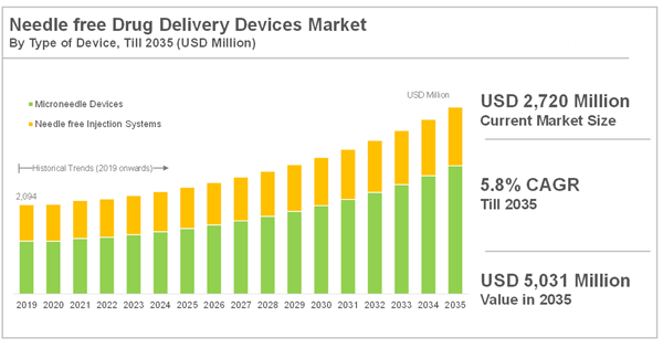 Dublin, March 25, 2025 (GLOBE NEWSWIRE) -- The "Needle Free Drug Delivery Devices Market Industry Trends and Forecasts to 2035 -- Distribution by Type of Device, Route of Administration, Actuation Mechanism, Product Usability, Application Area, Type of Load, Microneedle, Material Used, Intervention and Geography" report has been added to ResearchAndMarkets.com's offering.
