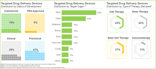- 15 stem cell therapies and 8 gene therapies emerged as the most likely drug candidates for delivery via targeted drug delivery devices; notably, 60% of these therapies are currently in phase II of clinical development.