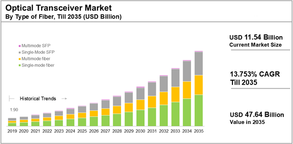 Dublin, May 08, 2025 (GLOBE NEWSWIRE) -- The "Optical Transceiver Market to 2035: Distribution by Type of Form Factor, Type of Data Rate, Type of Protocol, Type of Wavelength, Type of Fiber, Type of Connector, Distance as per Range, Area of Application, Company Size, End User, Business Model and Key Geographical Regionse" report has been added to ResearchAndMarkets.com's offering.