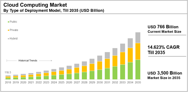 The global cloud computing market size is estimated to grow from USD 766 billion in 2025, to USD 3.50 trillion by 2035, at a CAGR of 14.623% during the forecast period to 2035.