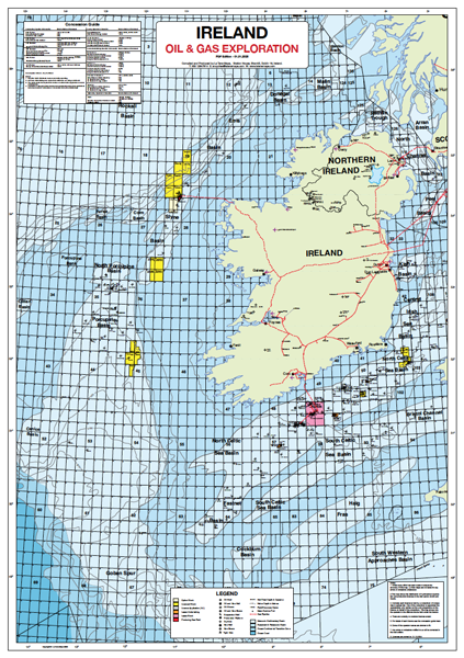 The full color map is a concession map and shows all exploration licences onshore and offshore Ireland (north and south) together with the operator's name and licence type (Lease, licence and option).
