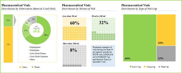 - Majority (60%) of the pharmaceutical vials have a capacity to hold less than 50 ml of drug product; however, very few (8%) vials are capable of storing more than 100 ml of therapeutic products.
