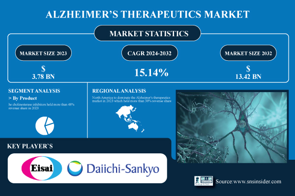 Austin, Dec. 01, 2025 (GLOBE NEWSWIRE) -- According to SNS Insider, The Alzheimer’s Therapeutics Market Size was valued at $3.78 Billion in 2023 and will reach $13.42 Billion by 2032, with a growing CAGR of 15.14% during 2024-2032.