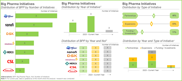- Big Pharma Initiatives: A detailed analysis of big pharma initiatives reported in the domain, on the basis of [A] year of initiative, [B] type of partnership, [C] type of expansion, and [D] type of vaccine focused.