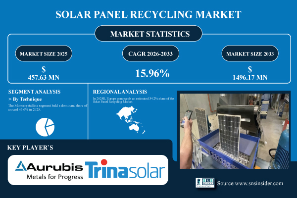 According to the SNS Insider,“The Solar Panel Recycling Market size was valued at USD 457.63 million in 2025E and is expected to reach USD 1496.17 million by 2033, growing at a CAGR of 15.96% over of 2026-2033.”