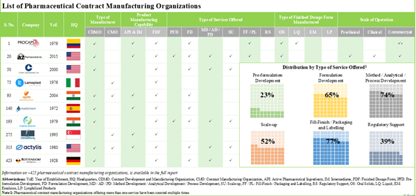 Currently, approximately 425 organizations provide pharmaceutical contract manufacturing services, most of which offer fill-finish, packaging, and labeling services. The FDF segment dominates, with about 15% of these companies equipped to manufacture all finished dosage forms. Companies are enhancing their small molecule manufacturing capabilities through mergers and acquisitions to establish a competitive edge.