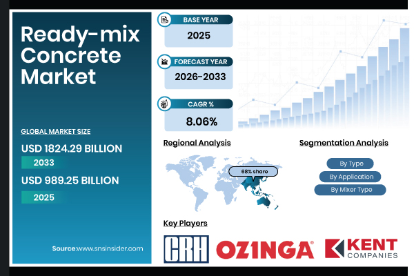 Austin, Dec. 11, 2025 (GLOBE NEWSWIRE) -- According to SNS Insider, The Ready-mix Concrete Market size is estimated at USD 989.25 billion in 2025 and is expected to reach USD 1824.29 billion by 2033, growing at a CAGR of 8.06% from 2026-2033. The market for ready-mix concrete is expanding as a result of increased infrastructure, urbanization, and the need for long-lasting, premium building materials. Market adoption is being accelerated by government investments in housing, transportation, and industrial developments.
