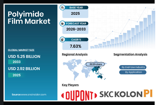Austin, Dec. 15, 2025 (GLOBE NEWSWIRE) -- According to SNS Insider, The Polyimide Film Market Size is estimated at USD 2.92 billion in 2025 and is expected to reach USD 5.25 billion by 2033, growing at a CAGR of 7.63% over the forecast period of 2026-2033. The growing need for high-performance insulating materials in the electronics, automotive, and aerospace sectors is propelling the market for polyimide films. The market is expanding due to growing acceptance in flexible printed circuits, wires, cables, and pressure-sensitive applications.